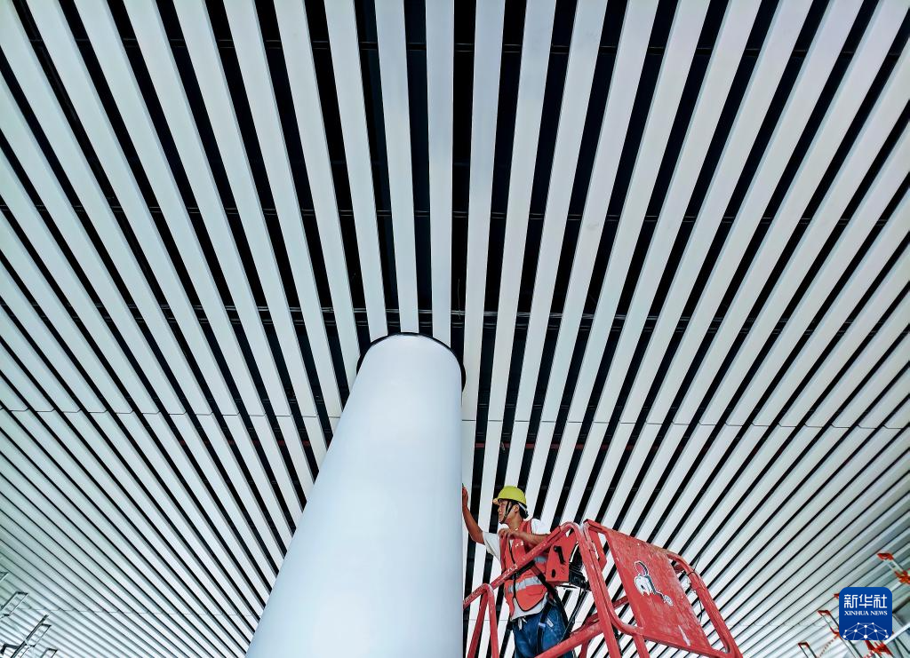 6月16日,在厦门翔安国际机场B指廊B2区建设施工现场,中建三局施工人员对结构柱进行打磨施工。新华社记者 魏培全 摄