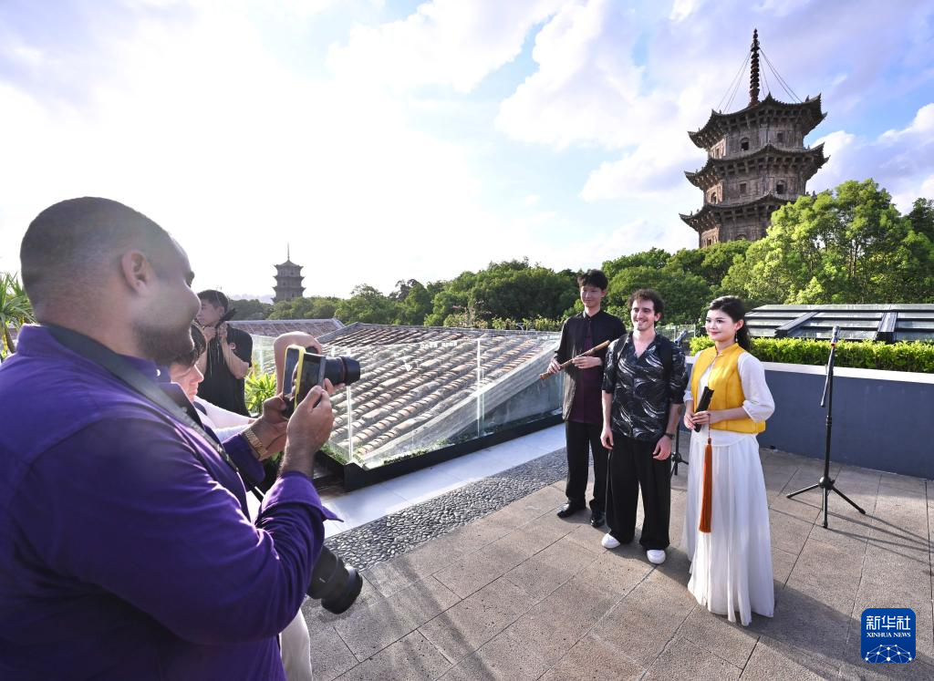 6月20日,在福建泉州西街游客服务中心观景台,一名外籍游客(中)与泉州南音艺人合影。新华社记者 姜克红 摄