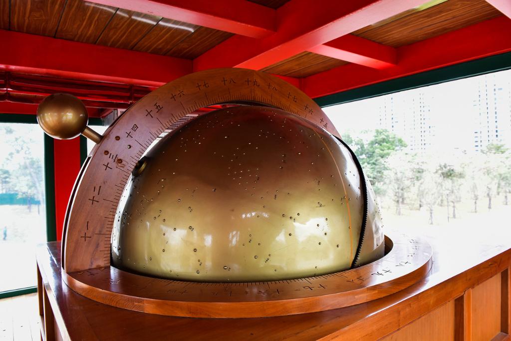 在厦门市同安区科技馆,还陈列着苏颂的另一项天文仪器——假天仪的复刻模型。它形如球状竹笼,外层糊纸,再按天上星宿的位置在纸上开孔。当人悬坐球内,扳动枢轴使球体转动,星光自孔透入,就能全面地看到星宿的出没运行。“可以说,假天仪是古时候人们观测星空的‘AR(增强现实)设备’,借助这个仪器,即使不懂天文的人也能轻易掌握二十八星宿的位置。”同安区科技馆馆长高水满说。