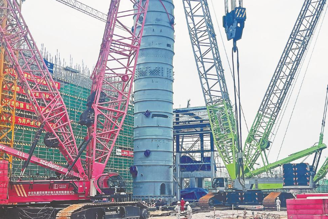 7月12日,中石化南化苯胺-橡胶助剂产业链项目传来捷报——20万吨/年苯胺流化床反应器成功吊装。此次成功安装的反应器重量达461吨,高度为35.2米,直径为6.7米,是苯胺生产的核心设备,通过流态化技术使硝基苯与氢气在催化剂作用下充分反应生成苯胺。与传统反应器相比,其反应效率更高、能耗更低,符合绿色生产要求,且产品质量稳定。总投资超40亿元的苯胺-橡胶助剂产业链项目先后被列为福建省和中国石化重点项目,投产后将在古雷石化基地形成每年30万吨的苯胺产能,为产业链下游企业提供持续稳定的原料供应。(记者 杜正蓝 通讯员 蔡彩霞 摄)