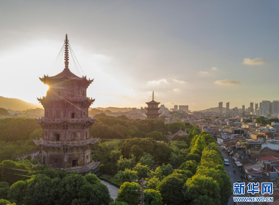 朝霞中的泉州开元寺东西塔。新华社记者 宋为伟 摄