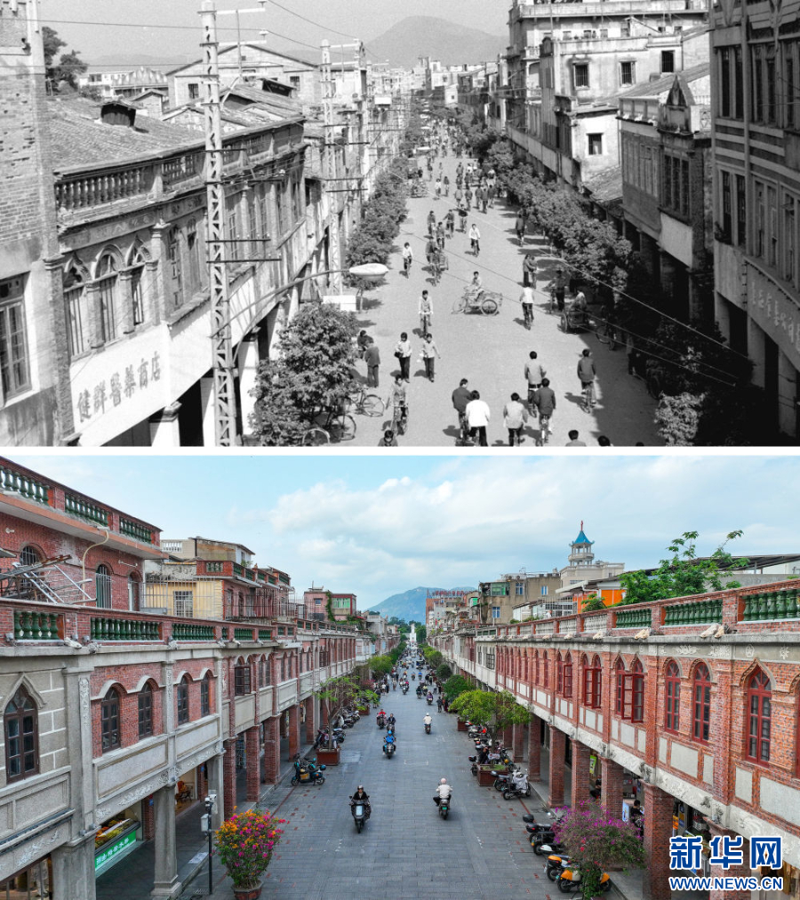 拼版照片:上图为泉州中山路(资料照片,新华社记者薛铁军摄);下图为2024年4月10日拍摄的泉州中山路(新华社记者周义摄)。