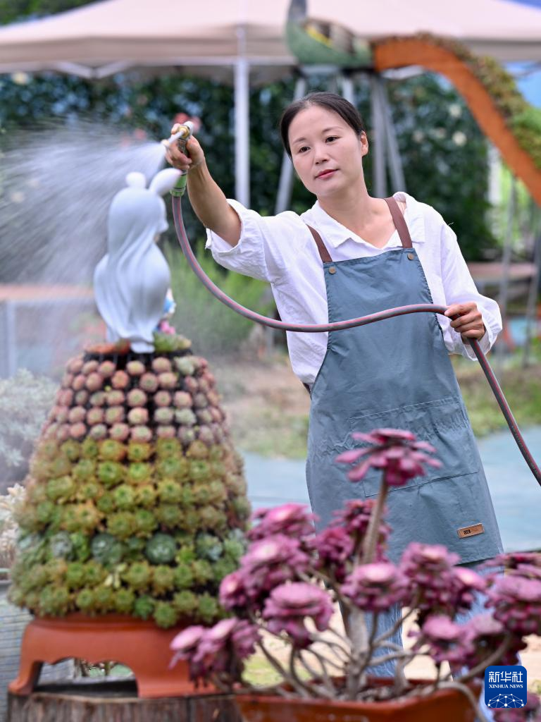 7月19日,在周宁静宇园艺有限公司多肉种植大棚,刘林为多肉盆栽浇水。新华社记者 姜克红 摄