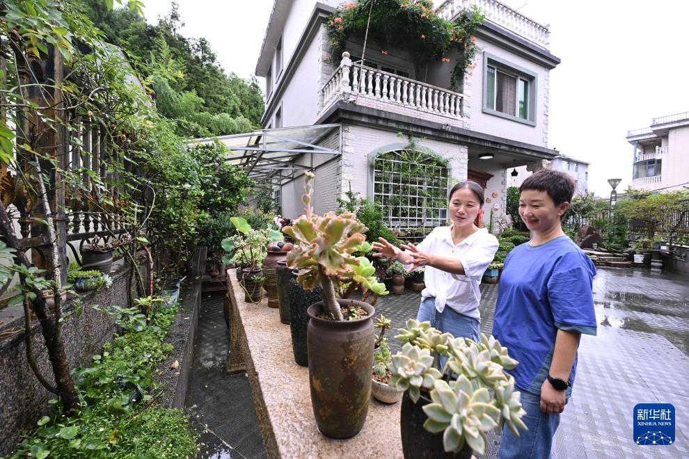 7月19日,在周宁县狮城镇洋庄村,刘林(左)与一名多肉植物爱好者交流种植技术。