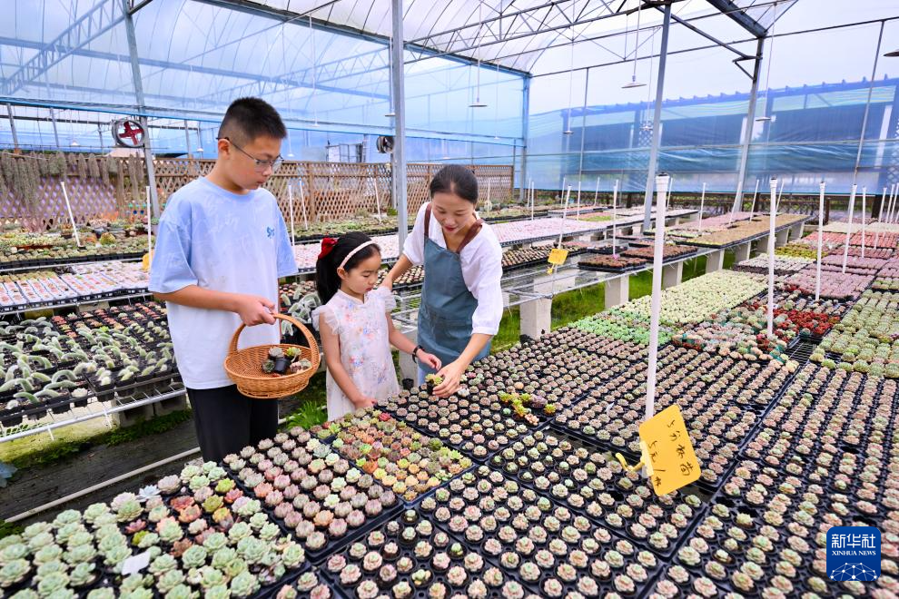 7月19日,在周宁静宇园艺有限公司多肉育种大棚,刘林(右一)带领小朋友挑选多肉苗。新华社记者 姜克红 摄