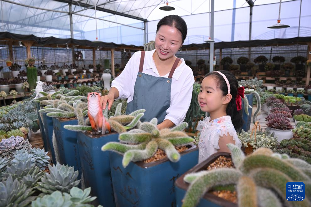 7月19日,在周宁静宇园艺有限公司多肉种植大棚,刘林(左)在向小游客介绍多肉创意盆栽。新华社记者 姜克红 摄