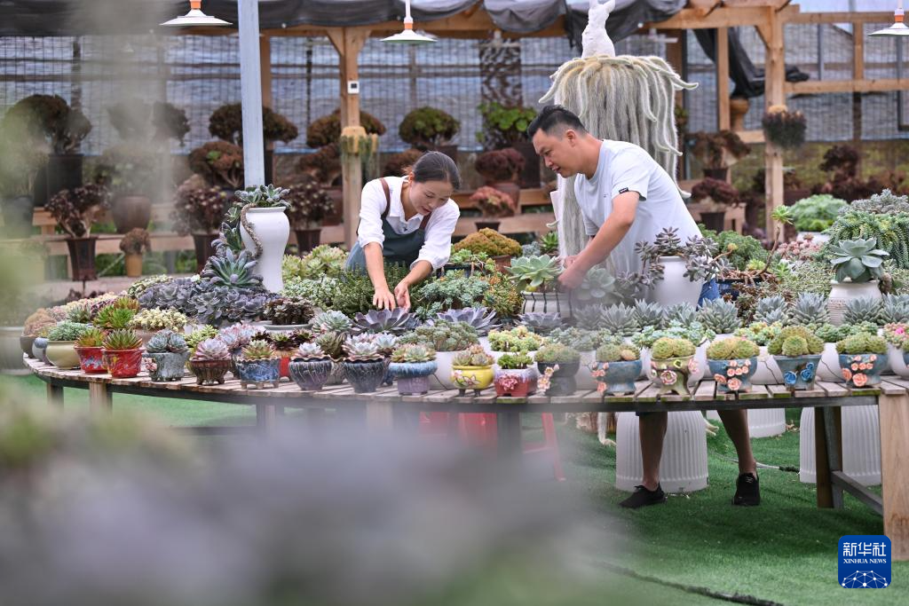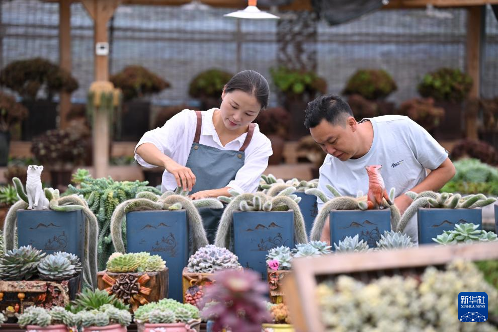 7月19日,在周宁静宇园艺有限公司多肉种植大棚,刘林(左)与丈夫张云昌共同打理多肉盆栽。新华社记者 姜克红 摄