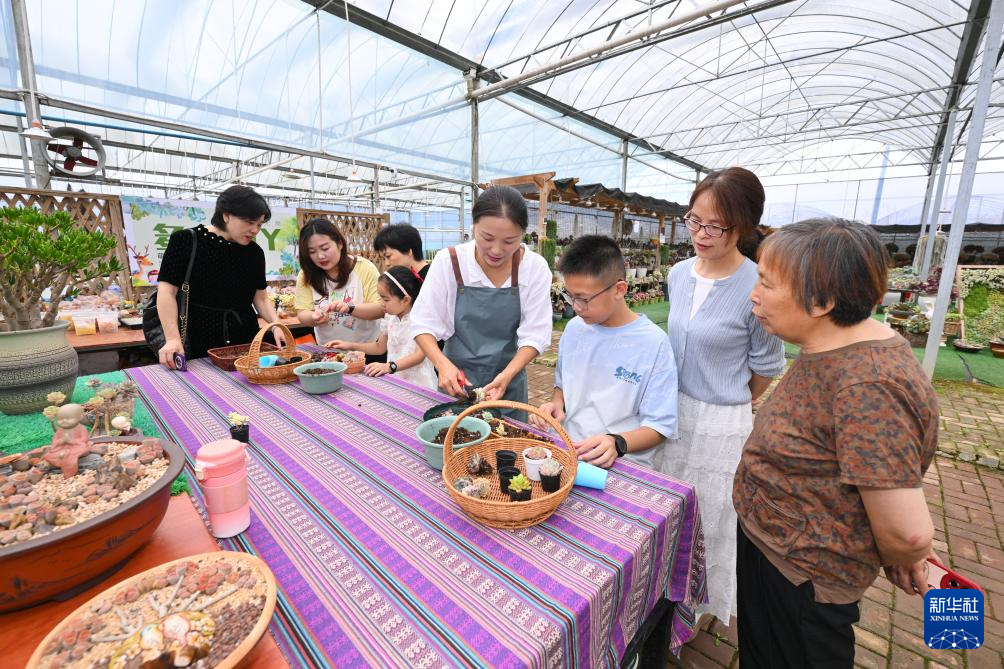 7月19日,在周宁静宇园艺有限公司多肉种植大棚,刘林(右四)指导小朋友制作创意多肉盆栽。新华社记者 姜克红 摄