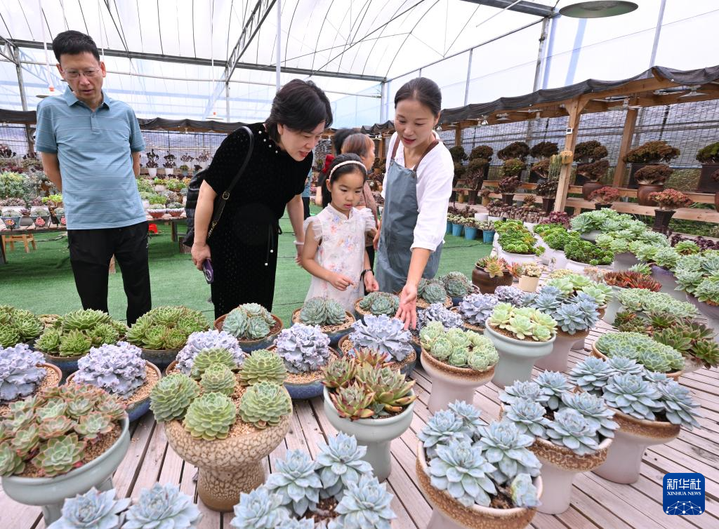 7月19日,在周宁静宇园艺有限公司多肉种植大棚,刘林(右一)带领游客参观多肉盆栽。新华社记者 姜克红 摄
