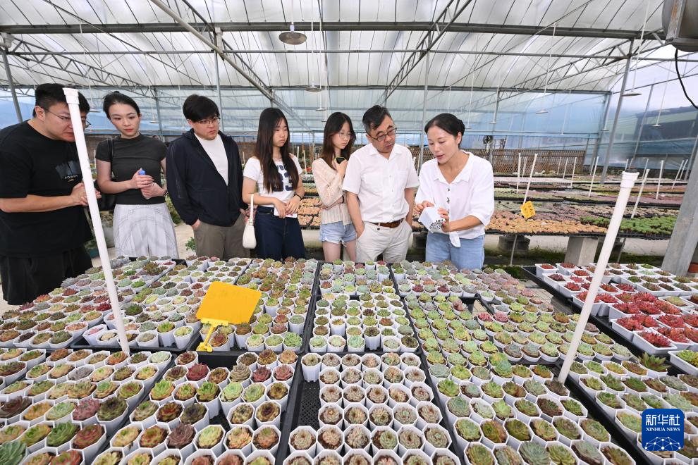 7月19日,在周宁静宇园艺有限公司多肉育苗大棚,刘林(右一)带领客人参观多肉苗种。新华社记者 姜克红 摄