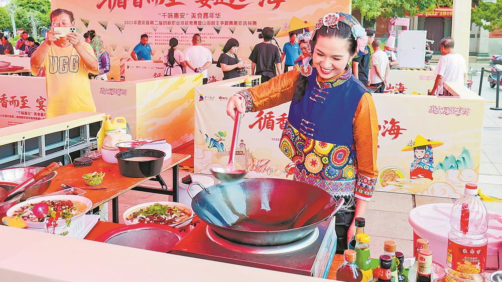 黑米蒸膏蟹升腾起氤氲鲜香,海蛎煎在铁板上嗞嗞作响,鱼露肉片汤升腾回转……灶台前,伴随身怀绝技的厨艺能手挥舞锅铲,一道道“惠女家宴”菜品和推陈出新的创新闽菜新鲜出炉。19日,在惠安县第二届创新职业技能竞赛暨山海厨王争霸赛惠安选拔赛现场,观众纷纷举起手机记录这烟火共舞的动人时刻。