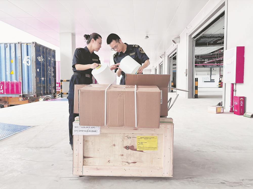 海关工作人员对首批进出福州长乐国际机场综保区的货物进行查验。