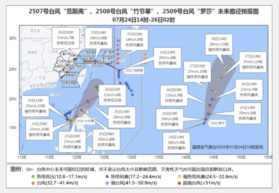 气象部门预测,“范斯高”26日靠近闽浙沿海时,强度将明显减弱,可能在近海徘徊或消散,也不排除登陆的可能性,甚至还可能与“竹节草”环流合并。届时,东南沿海将迎来连日阵性风雨,先刮风后降雨,强降雨范围不是很大,但沿海局地可能较强。