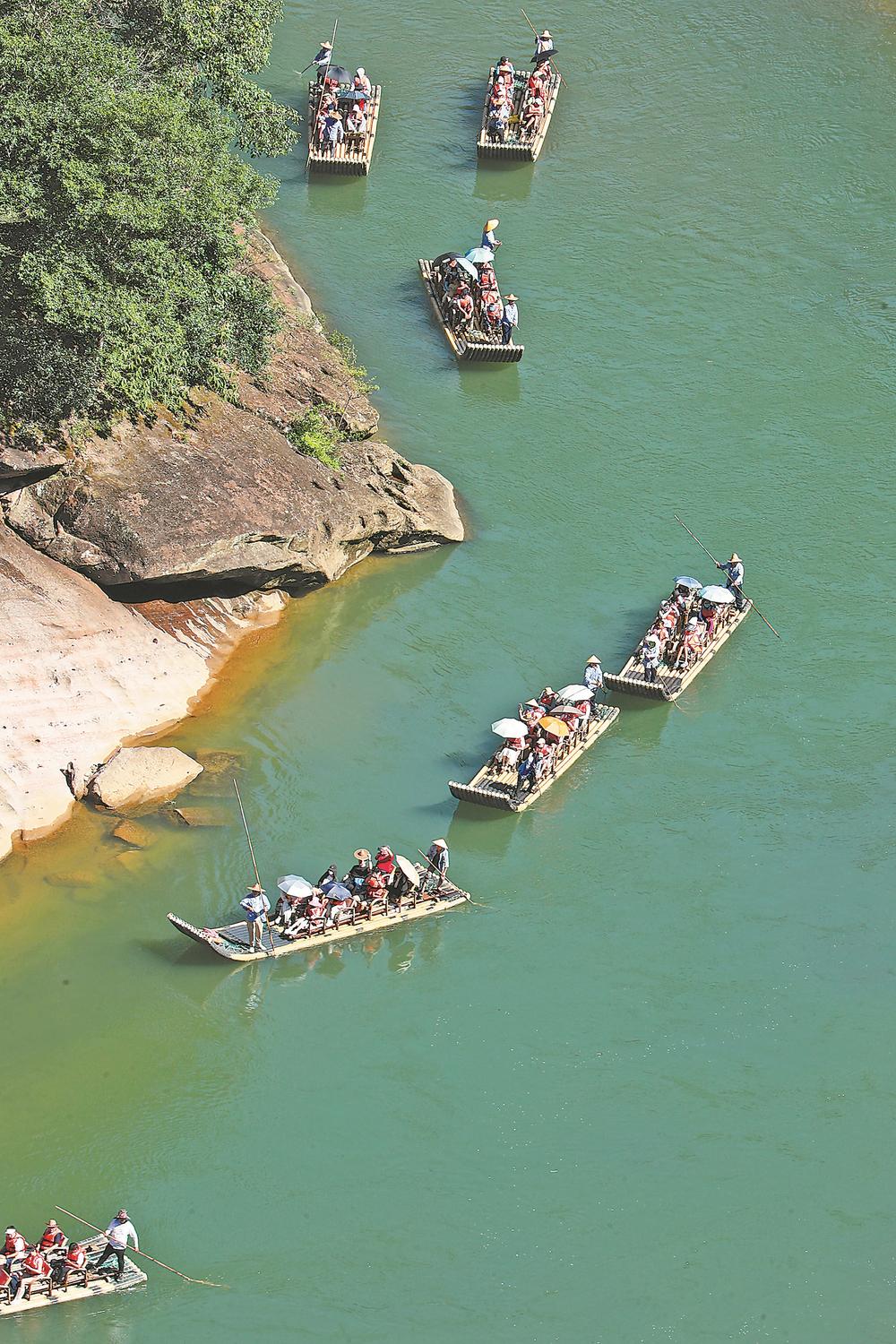 《2025携程口碑榜年度榜单》于近日发布,武夷山国家公园入选“2025全球50玩水避暑景点”。图为游人乘坐竹筏在武夷山国家公园游览九曲溪欣赏两岸风光。(邱汝泉 摄)