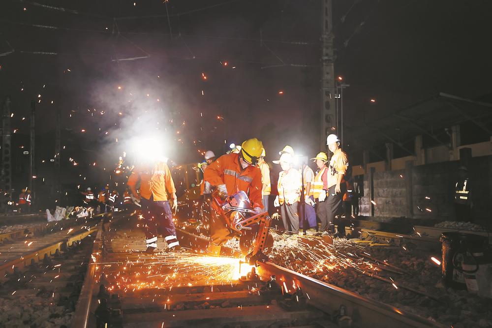 “开始作业。”8月12日5时,在鹰厦铁路来舟站Ⅱ场南端,随着国铁南昌局南平工务段邵武综合机修车间主任丁振龙一声令下,120余名作业人员迅速上道,进行成组更换道岔施工。随着锯轨机的启动,轰鸣声打破深山的寂静,一道道璀璨的火花洒向星空。朦胧夜色中,头灯、大型照明设备、挖掘机探照灯交替闪烁,成为一道亮丽的风景。