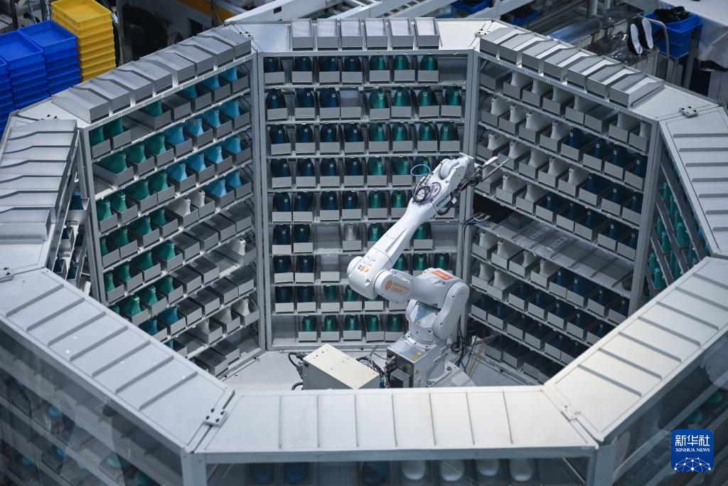 这是8月19日在福建莆田双驰科技定制工厂店智能工厂拍摄的一台高效运转的机械臂。新华社记者 周义 摄