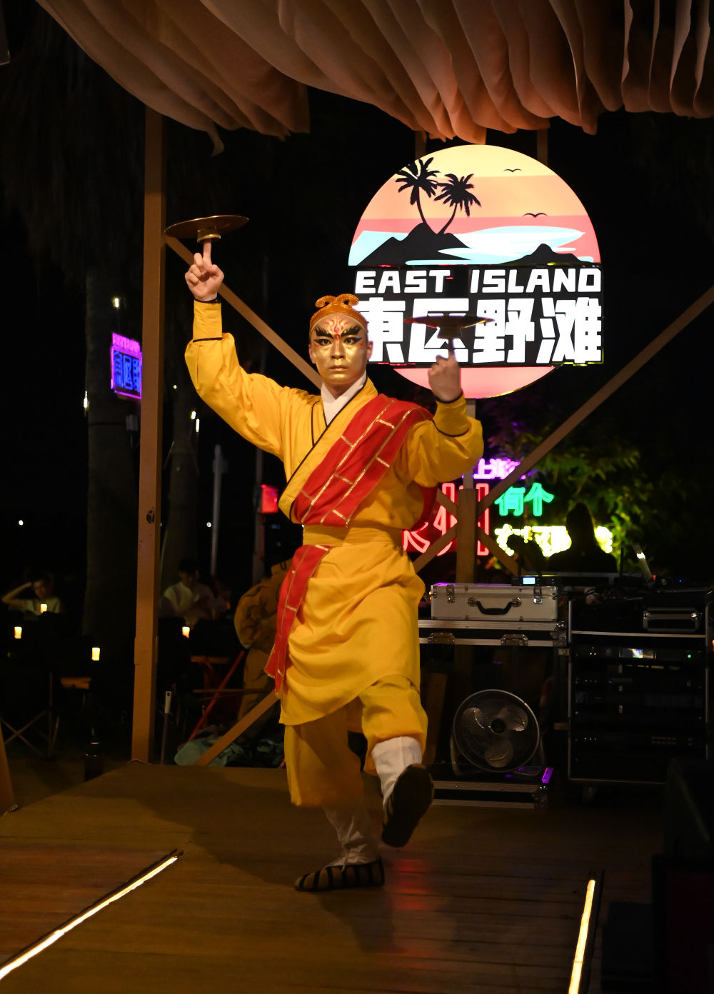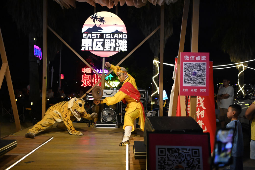 8月18日晚,在东区野滩夜市,泉州市打城戏传承中心的演员表演打城戏《献铙钹》。