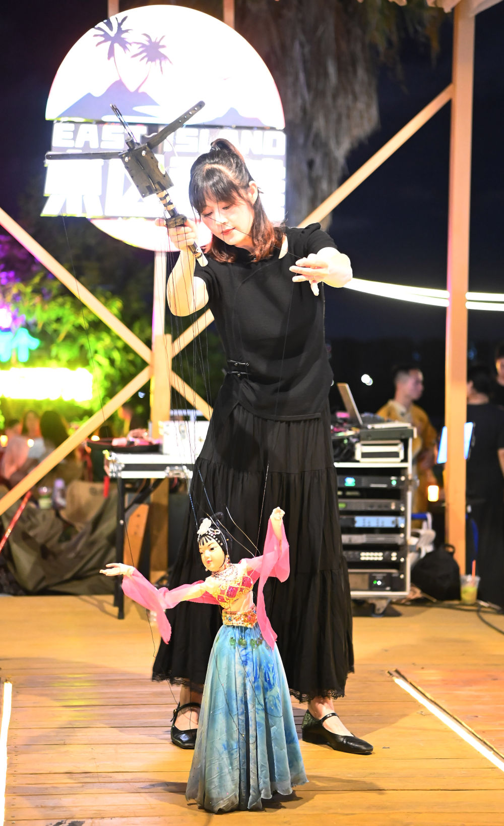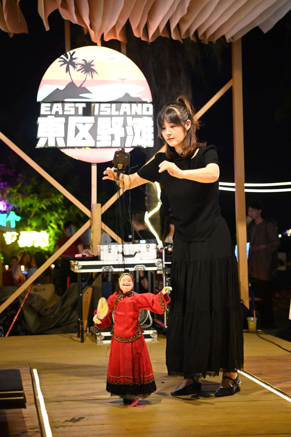 8月18日晚,在东区野滩夜市,泉州市提线木偶戏传承保护中心二级演员吴晓晖表演泉州提线木偶戏小节目《青春梦》。