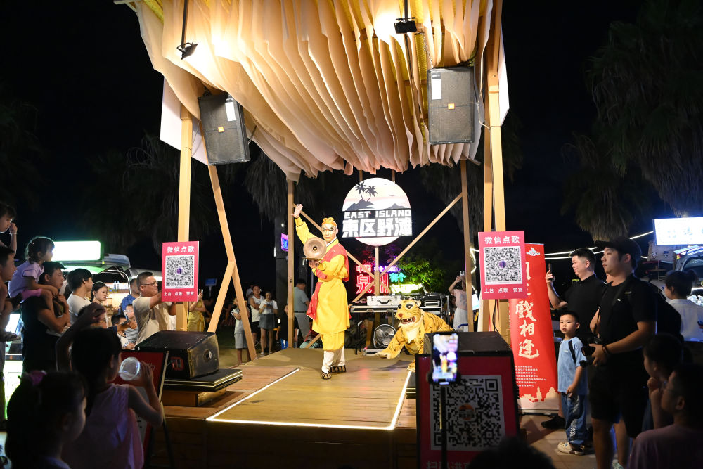 8月18日晚,人们在东区野滩夜市观看打城戏《献铙钹》。