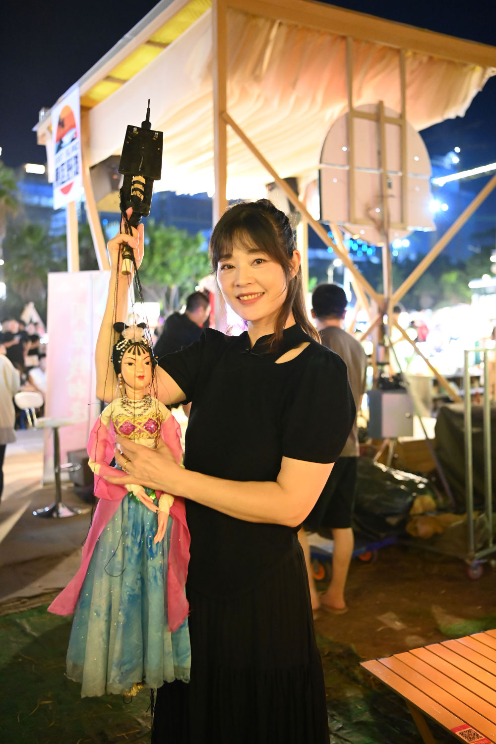 8月18日晚,在东区野滩夜市,泉州市提线木偶戏传承保护中心二级演员吴晓晖与提线木偶合影。
