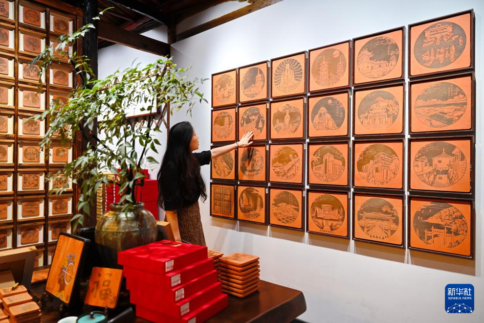 8月19日,在福建晋江梧林村,一家工艺品店经营者在介绍闽南红砖雕艺术品。新华社记者 林善传 摄