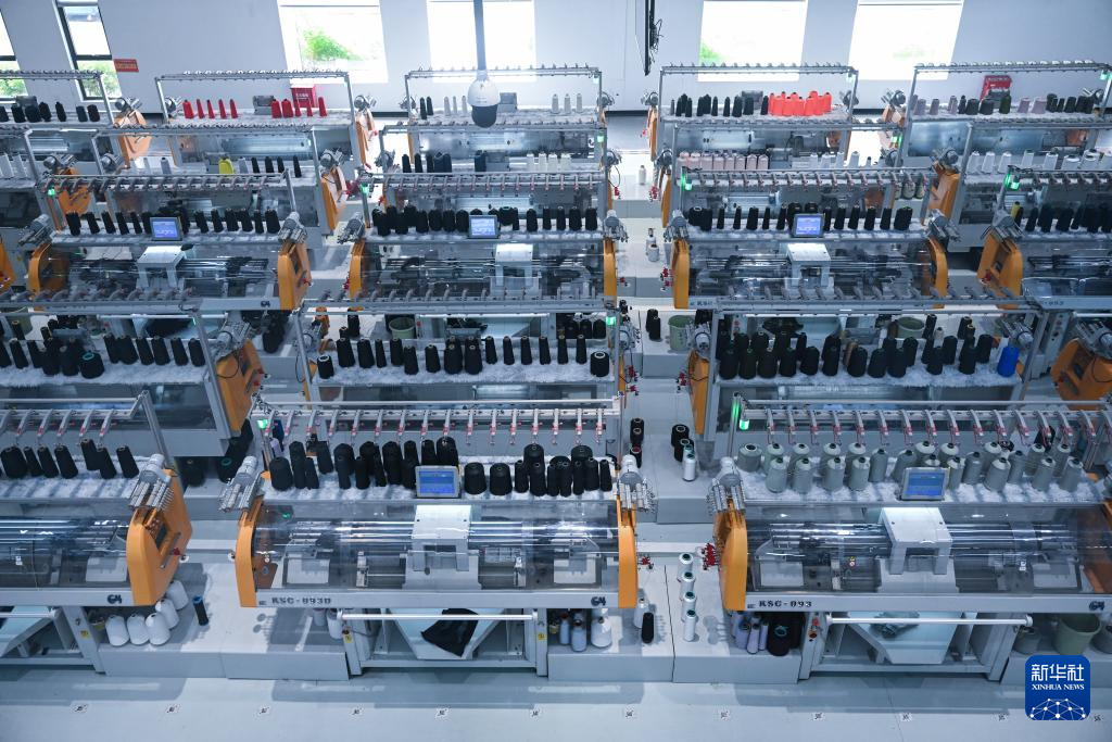 在信泰(石狮)科技有限公司智慧车间内,全自动针织横机满产运行。公司实现了数字化生产,电脑一键下达编织指令,机器自动拉纱线成布,一名工人能够同时管理10多台机器。