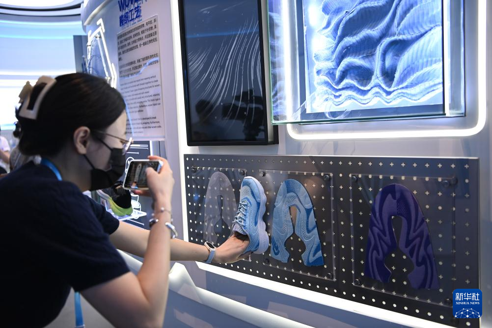 8月20日,参观者在信泰(石狮)科技有限公司拍摄鞋面梭织面料。新华社记者 肖潇 摄