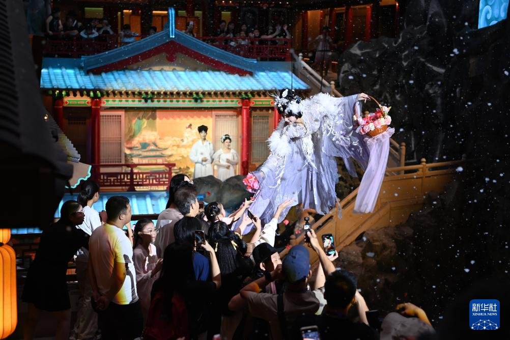 8月22日,在位于厦门东渡邮轮母港片区的闽南文化主题景区“屿见闽南·时光幻境”,“白鹭女神”与观众互动。