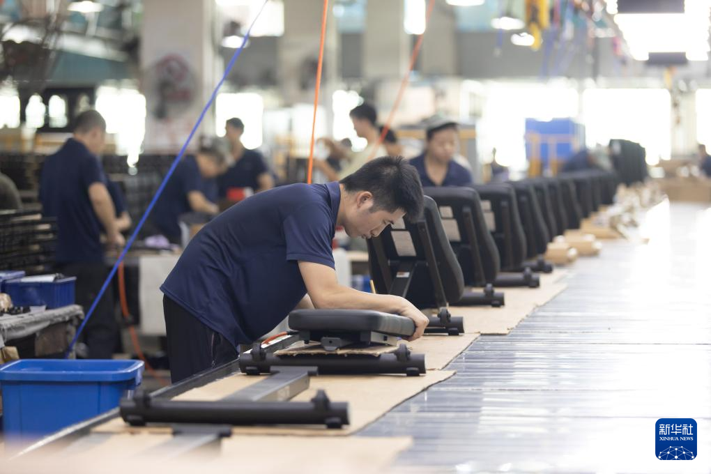9月12日,福建泉州一家体育器材工厂的工人在组装跑步机。新华社发(连静毅摄)
