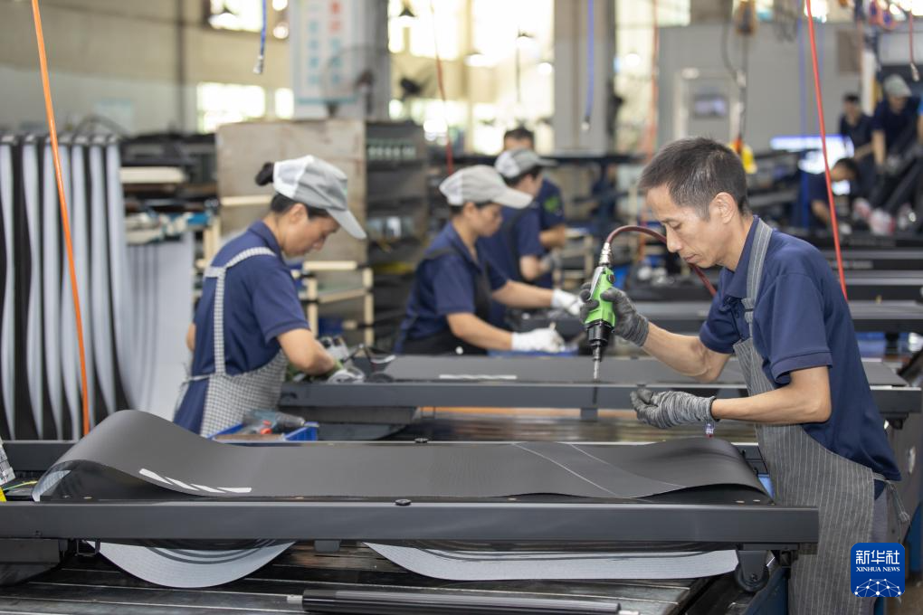 9月12日,福建晋江一家体育器材工厂的工人在组装体育器材软垫。新华社发(连静毅摄)