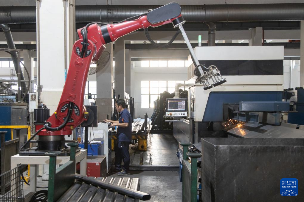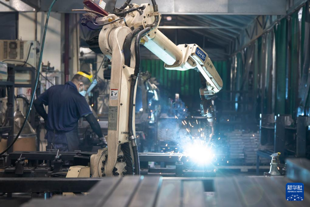 9月12日,在福建泉州一家体育器材工厂内,工业机器人进行激光焊接。新华社发(连静毅摄)