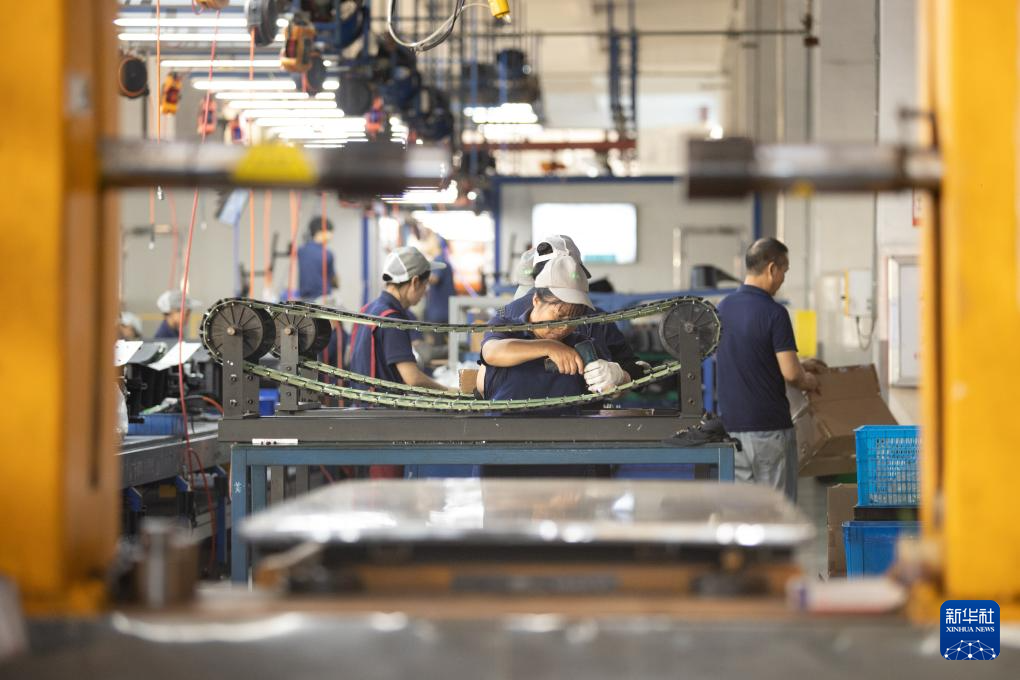 9月12日,福建晋江一家体育器材工厂的工人在车间流水线上组装跑步机。新华社发(连静毅摄)