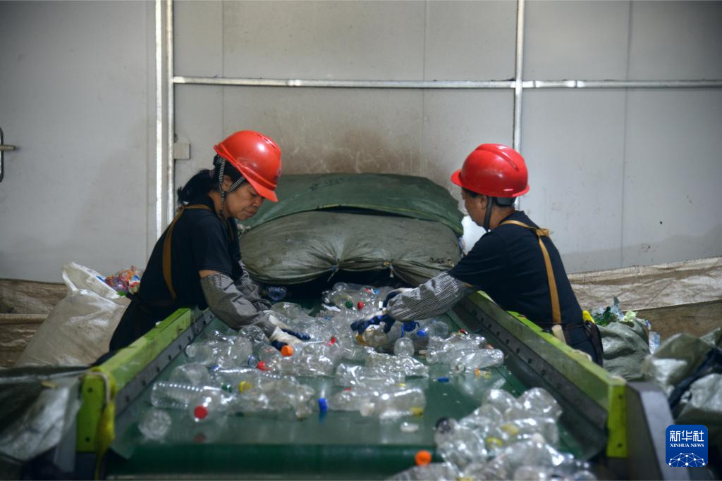 在位于福州马尾区的福州城投再生资源分拣中心,工人整理智慧光选机筛选后的可回收垃圾(9月13日摄)。新华社记者 李昊泽 摄