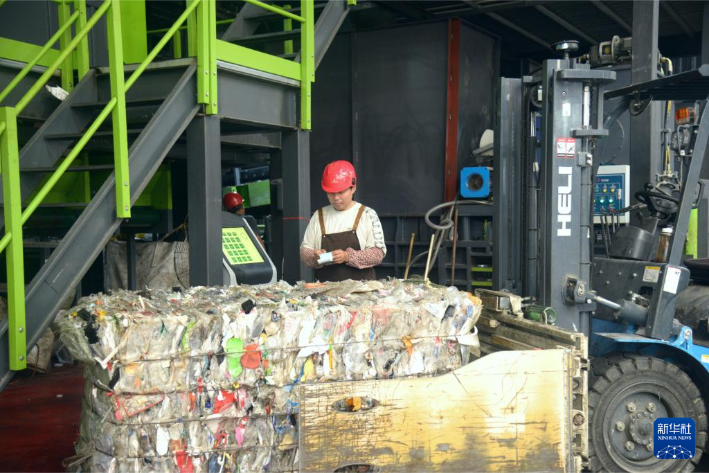 在位于福州马尾区的福州城投再生资源分拣中心,工人为分拣后压缩的可回收垃圾称重(9月13日摄)。新华社记者 李昊泽 摄