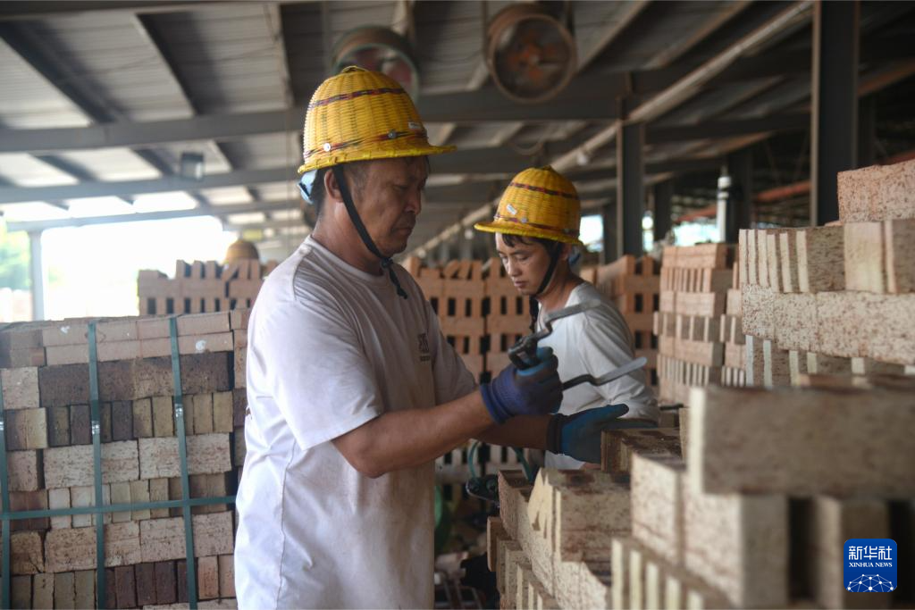 在福州闽侯县一家建筑垃圾资源化利用企业的生产园区,一批建筑垃圾制作的砖块烧制完成,工人们在筛选、捆扎(9月13日摄)。新华社记者 李昊泽 摄