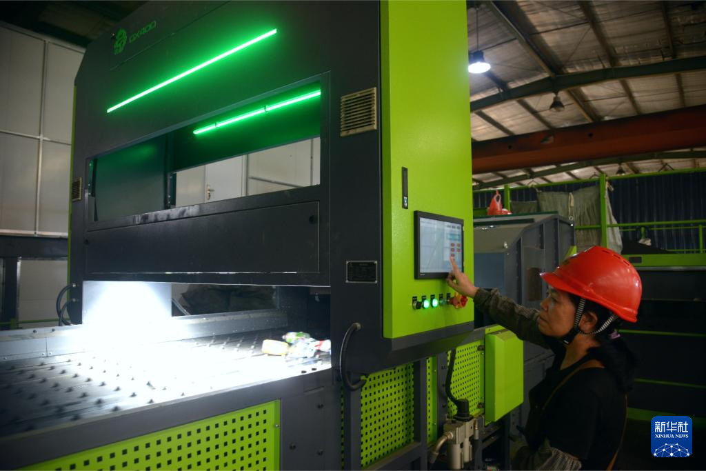 福州城投再生资源分拣中心内,工人操作智能光选机筛选塑料瓶等可回收垃圾。新华社记者 李昊泽 摄