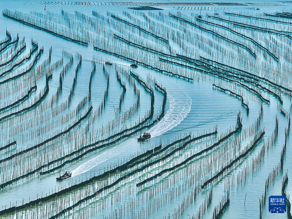 秋季,北岐滩涂进入紫菜采收旺季。滩涂上,竹竿整齐排列、铺展如织、框格井然,自岸边向海际绵延,蔚为壮观。潮水上涨时,船只穿梭于紫菜架之间,与粼粼波光、远方山岛交相辉映,融为一体;退潮后,滩涂呈现出虎皮状的斑纹肌理,在夕阳映照下熠熠生辉。