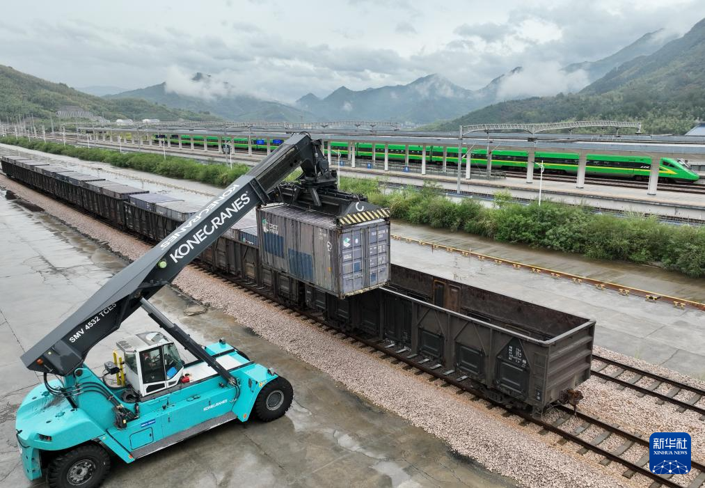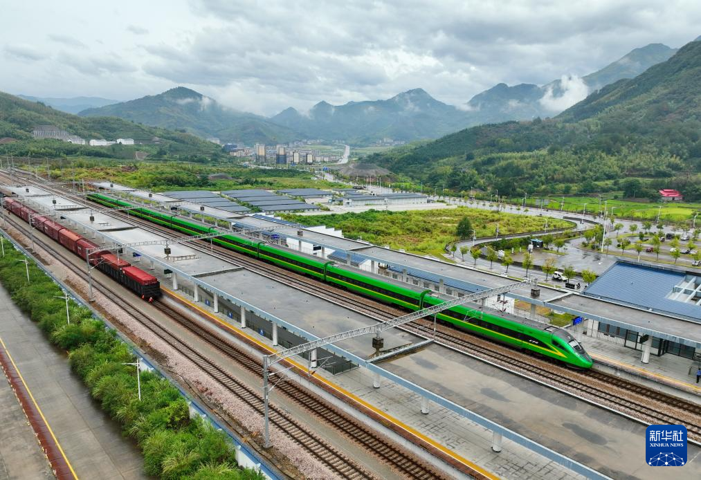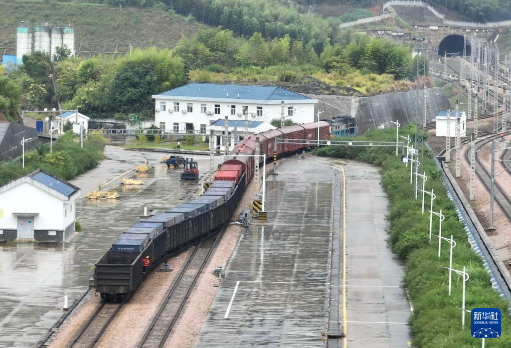 9月24日,货运列车开进衢宁铁路宁德营业部政和营业室装运周边县市运往世界各地的货品(无人机照片)。新华社记者 林善传 摄