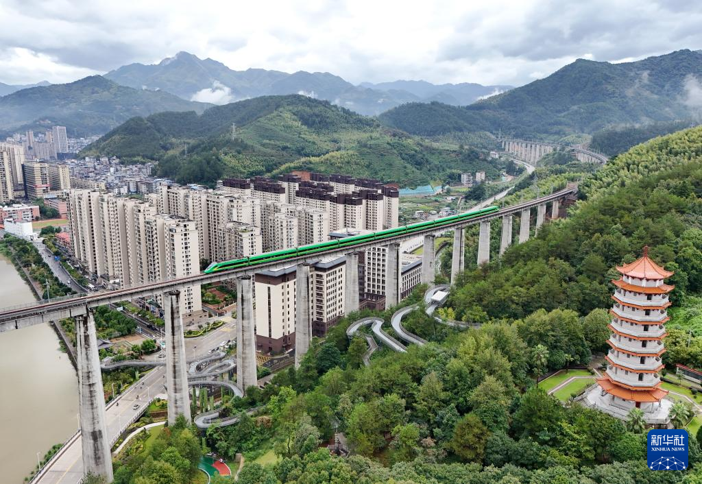 9月24日,“绿巨人”新型动车通过衢宁铁路政和熊城特大桥(无人机照片)。新华社记者 林善传 摄