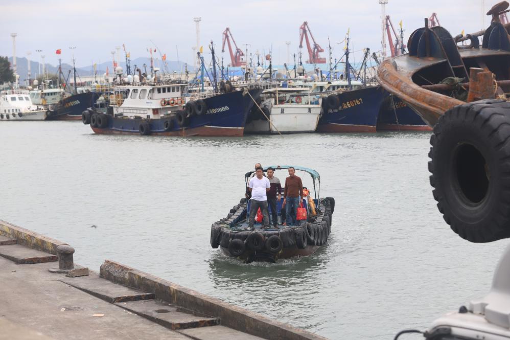 11月10日,在福建厦门高崎闽台中心渔港,从渔船上撤离下来的渔民乘坐小船准备靠岸。新华社发(曾德猛摄)