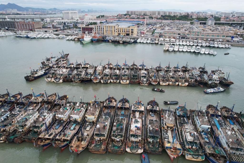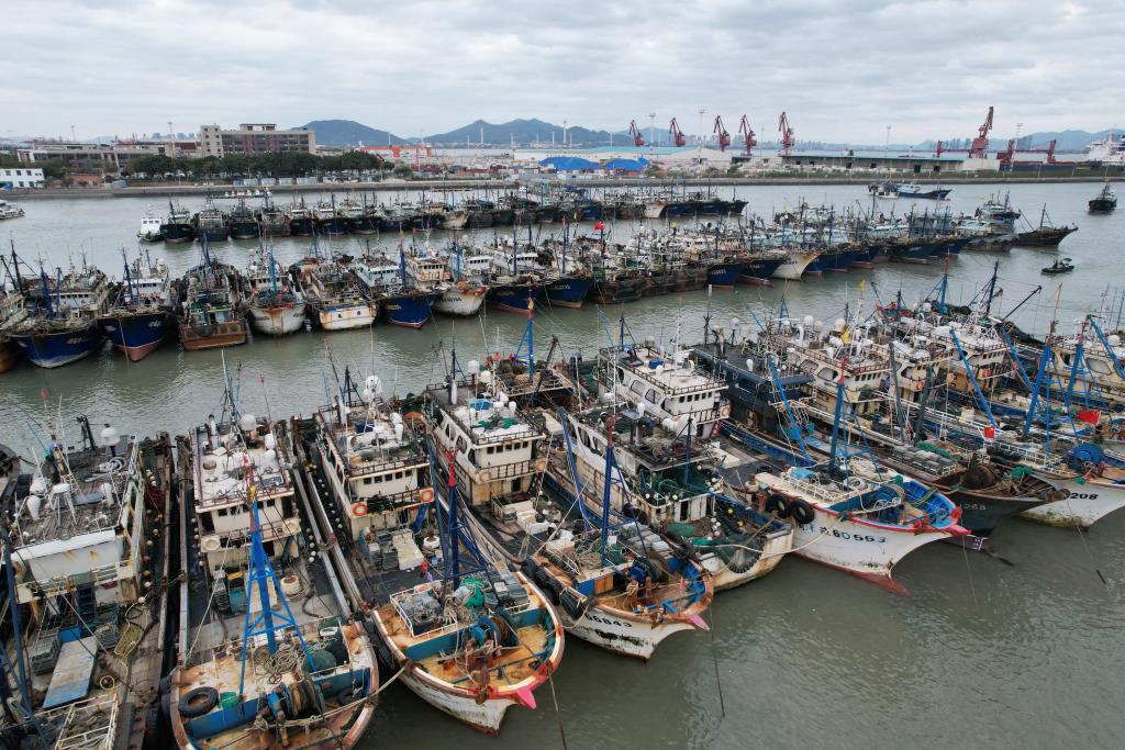 11月10日,大批渔船停靠在福建厦门高崎闽台中心渔港躲避台风(无人机照片)。新华社发(曾德猛摄)