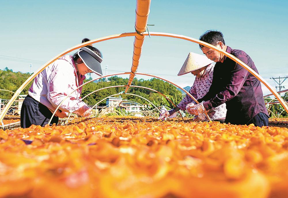 11月10日,龙岩市永定区陈东乡城东村的柿饼晾晒场一派繁忙。柿农徐满娣正带着村民忙着制作订单柿饼,竹架上金灿灿的柿饼整齐排列,远远望去,仿佛给大地披上了一层“黄金甲”。