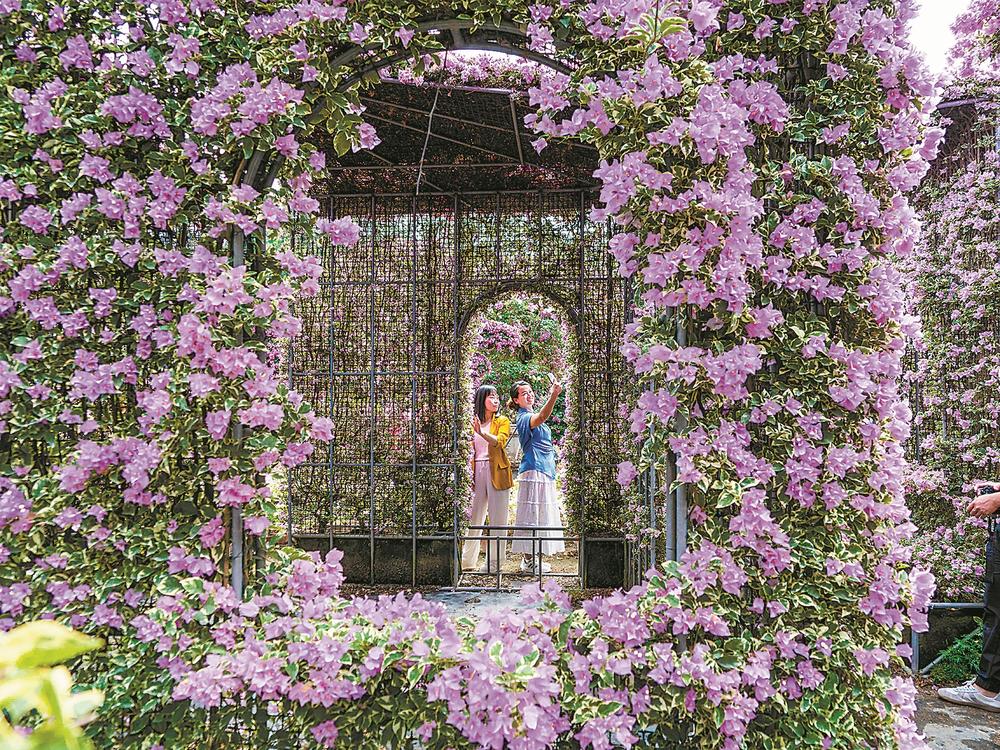秋冬之交,漳州三角梅迎来盛花期。漳州是全国最大的三角梅生产基地,三角梅种植面积达4万亩,品种超400种,产量占全国的七成。图为在漳州高新区九湖镇木棉村的华蓉三角梅园艺场内,绚烂多姿的三角梅“花房”吸引市民拍照打卡。(通讯员 张旭 摄)