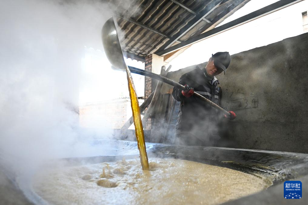 12月20日,积善村村民在熬制红糖。新华社记者 周义 摄