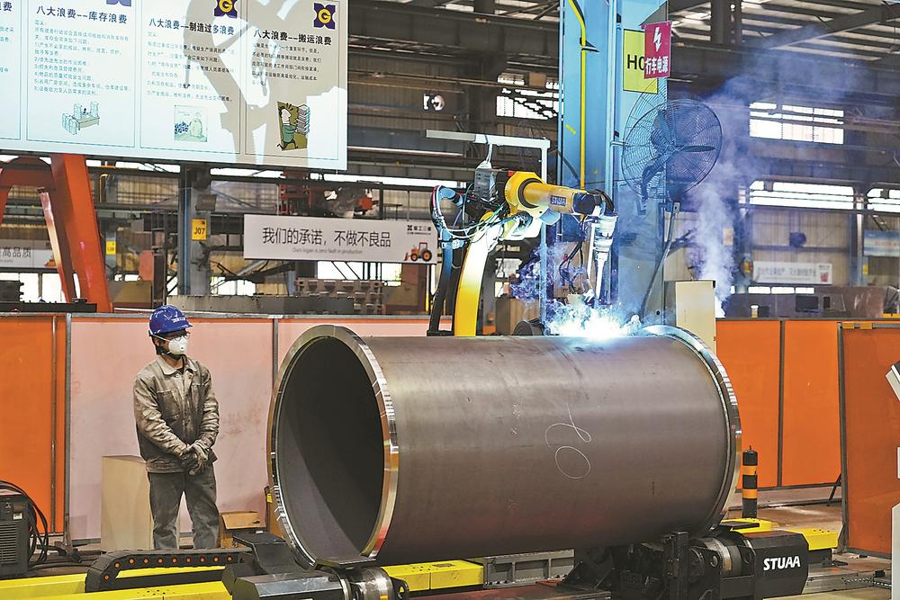 "1月7日,在厦工(三明)重型机器有限公司车间,工人操作焊接机器人精准焊接电机机座。"