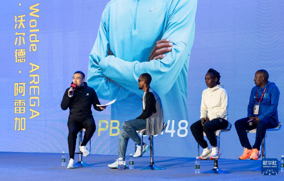 1月10日,外籍运动员代表、埃塞俄比亚选手达维特·沃尔德·阿雷加(左二)和鲁蒂·阿加·索拉(右二)出席见面会。新华社记者 魏培全 摄